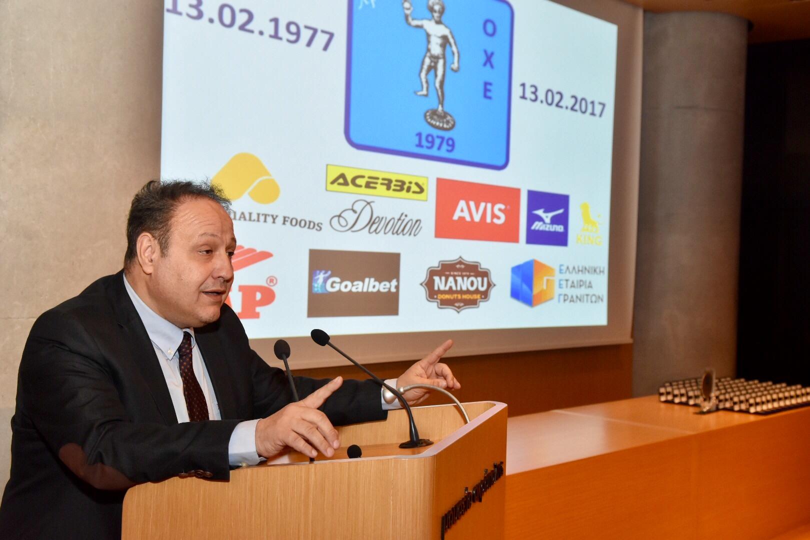 Κώστας Γκαντής (Πρόεδρος ΟΧΕ): «Καλησπέρα σε όλους, κύριε Γενικέ Γραμματέα Αθλητισμού, Κύριε Πρόεδρε της Διεθνούς Ομοσπονδίας, Κύριε Αγγελούδη από την ΕΟΕ, κύριε εκπρόσωπε της Περιφέρειας Αττικής, συνάδελφοι από το Δ.Σ., χορηγοί της Ομοσπονδίας, τιμώμενοι, φίλαθλοι. Όλος ο κόσμος του χάντμπολ σήμερα γιορτάζει τα 40 χρόνια από την γέννηση του αθλήματος. Σαράντα χρόνια από την πρώτη πάσα, το πρώτο σουτ, το πρώτο γκολ, στο τουρνουά του Αμυνταίου της Φλώρινας. Και επειδή στη ζωή του ανθρώπου τα 40 χρόνια, θεωρείται έτος ωρίμανσης, έτσι και στην δική μας την περίπτωση έφτασε η ώρα να επαναπροσδιορίσει στόχους, να χαράξει νέα στρατηγική, νέους ορίζοντες μέσα σε ένα περιβάλλον το ίδιο δύσκολο, όπως και τότε. Εξάλλου τα αιτήματα του αθλήματος παραμένουν ίδια: Το γηπεδικό, η τηλεόραση, το Εθνικό προπονητήριο. Στην κρίση γεννήθηκε το χάντμπολ, στην κρίση είναι και η ευκαιρία του να αναγεννηθεί. Σήμερα γιορτάζουμε και τιμούμε τους πρώτους των πρώτων. Τους πρώτους πρωταθλητές, τις πρώτες Εθνικές αποστολές. Ήρθε η ώρα και να θυμηθούμε, αλλά και να γνωρίσουμε κάποιους από αυτούς που δημιούργησαν το ελληνικό χάντμπολ. Μέσα στην διαρκή του πάλη σε αυτά τα 40 χρόνια το άθλημα κατάφερε να αλλάξει πολλά πράγματα, αγωνιστικά, διοικητικά, αλλά δεν έφτασε ακόμα στην κορύφωση του. Γίνονται προσπάθειες να λυθεί το πρόβλημα των εγκαταστάσεων και σε αυτό η πολιτεία είναι αρωγός, όπως και η στήριξη των ιδιωτών και των ανθρώπων του αθλήματος. Θα πάρουμε δύναμη σήμερα από τους πρώτους για να γίνουμε πρώτοι».