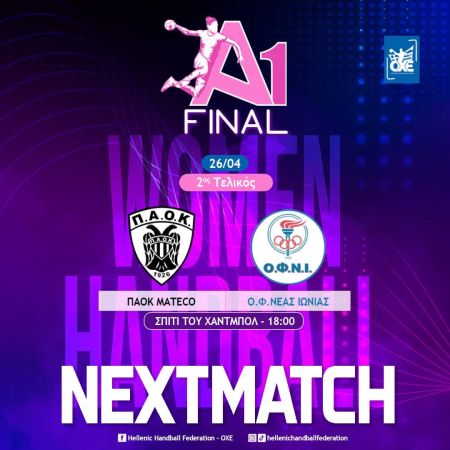 Το απόγευμα της Τετάρτης (26/4 - 18:00), ο ΠΑΟΚ υποδέχεται τη Νέα Ιωνία στον δεύτερο τελικό. Στην πρώτη αναμέτρηση, ο "Δικέφαλος του Βορρά" άλωσε την έδρα της Νέας Ιωνίας, έκανε το "μπρέικ" παίρνοντας τη νίκη με 18-19 και πλέον αναζητά τη δεύτερη νίκη που θα τον φέρει πιο κοντά στην κατάκτηση του τίτλου, έχοντας την ψυχολογία με το μέρος του.