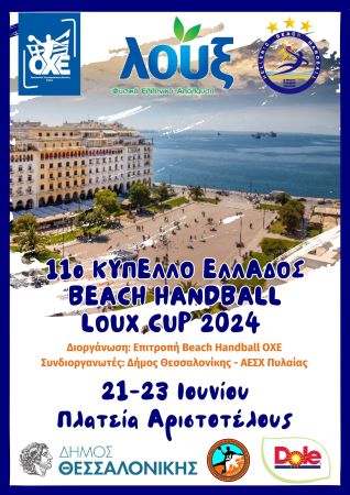 Η Επιτροπή Beach Handball της Ομοσπονδίας Χειροσφαιρίσεως Ελλάδος με χαρά ανακοινώνει τη διεξαγωγή του 11ου Κυπέλλου Ελλάδος- Loux Cup 2024 -ενταγμένο στο 25ο Πανελλήνιο Πρωτάθλημα Λουξ- στην πλατεία Αριστοτέλους το διάστημα 21-23 Ιουνίου με συνδιοργανωτές το Δήμο Θεσσαλονίκης, τoν ΑΕΣΧ Πυλαίας και μεγάλο χορηγό τη Λουξ.