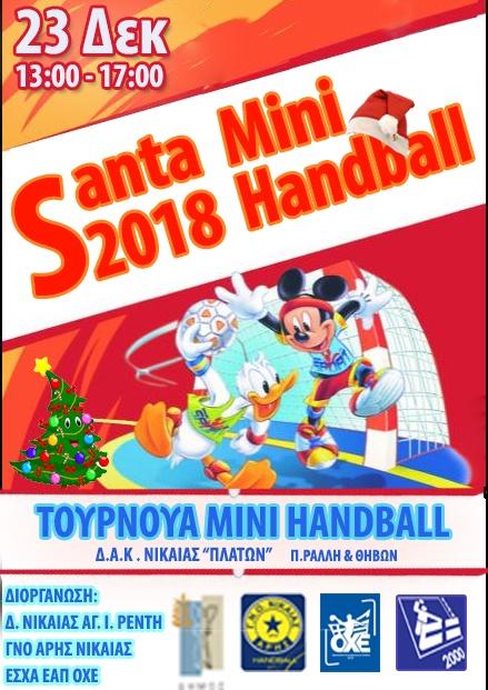 Η ΕΑΠ/ΟΧΕ, η ΕΣΧΑ, ο Άρης Νίκαιας και ο Δήμος Νίκαιας- Αγίου Ιωάννη Ρέντη, διοργανώνουν στον «Πλάτωνα» την Κυριακή 23 Δεκεμβρίου 2018, ώρες 13:00-17:00 τουρνουά μίνι χάντμπολ με την ονομασία «Santa Mini Handball».
