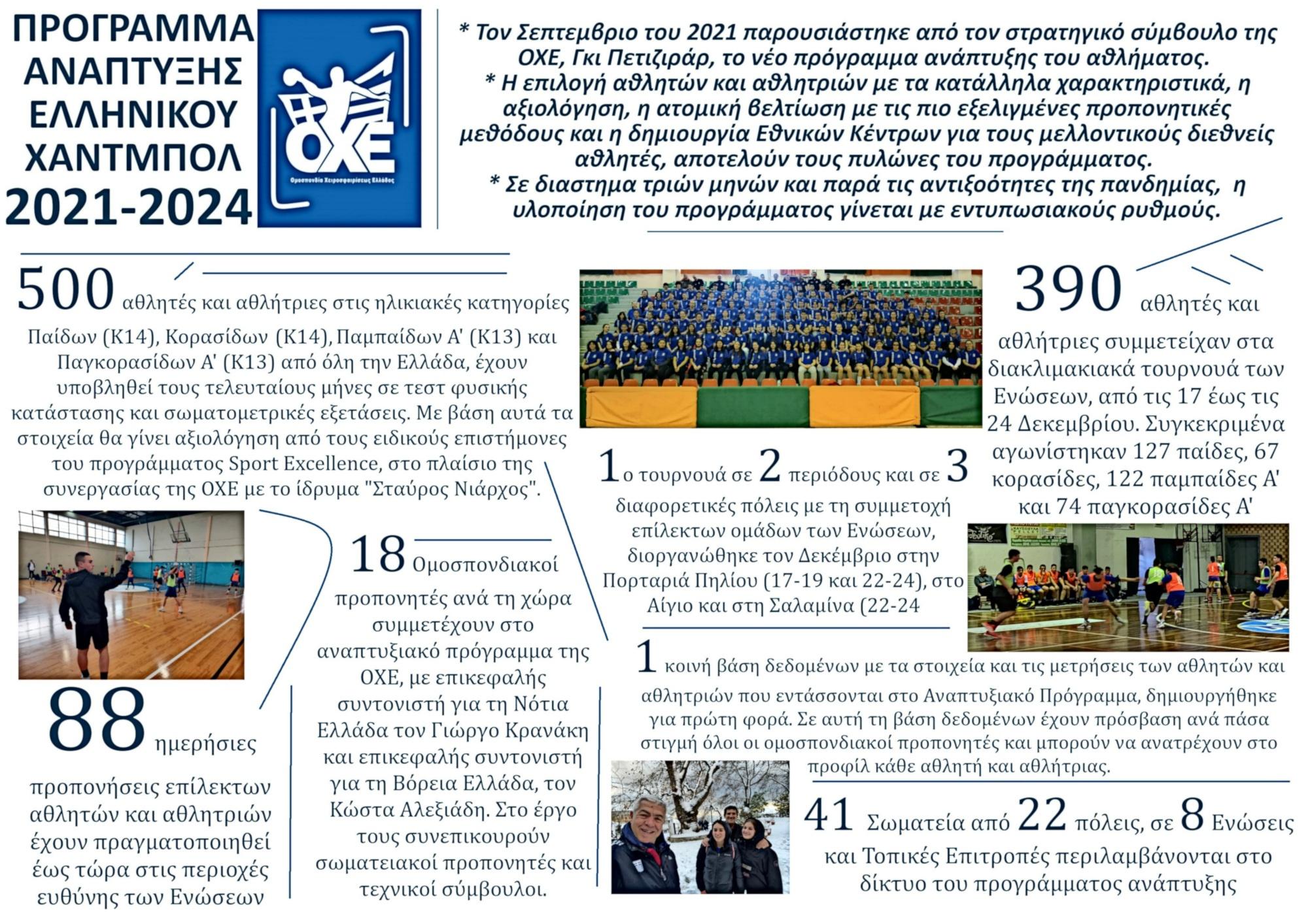 Με απώτερο στόχο τη δημιουργία αθλητών και αθλητριών που θα φέρουν τις Εθνικές ομάδες στην ελίτ του παγκόσμιου χάντμπολ, εγκρίθηκε από τη Γενική Συνέλευση των Σωματείων και ξεκίνησε από τον Σεπτέμβριο η εφαρμογή του προγράμματος που εκπόνησε ο στρατηγικός σύμβουλος Γκι Πετιζιράρ και εκτελείται από τους ομοσπονδιακούς προπονητές και τους τεχνικούς συμβούλους της ΟΧΕ σε όλη τη χώρα.