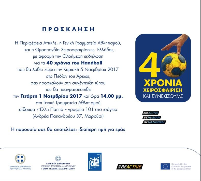 Η εκδήλωση με τίτλο «40 χρόνια και συνεχίζουμε...» εντάσσεται στο πλαίσιο των εορτασμών για τη συμπλήρωση 40 χρόνων (1977-2017) από τη γέννηση του ελληνικού χάντμπολ.