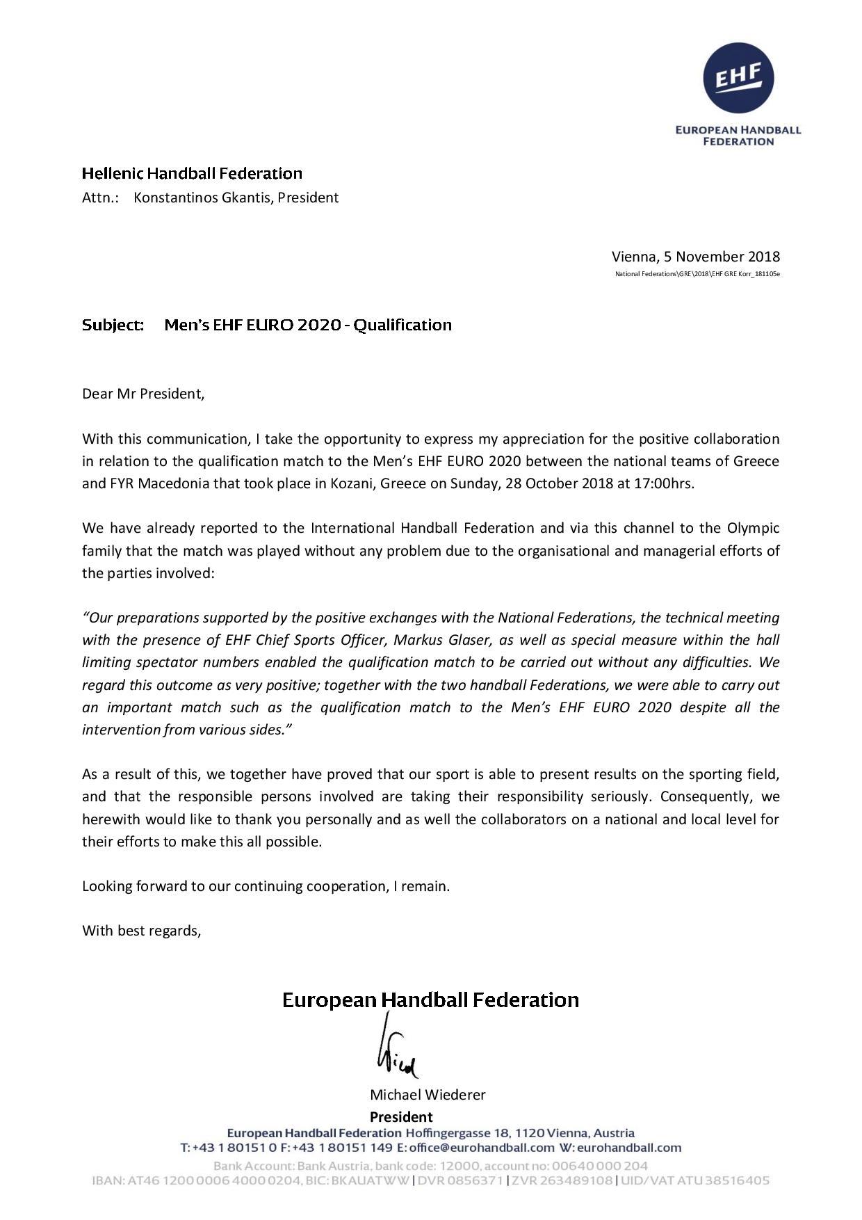 Ο Πρόεδρος της Ευρωπαϊκής Ομοσπονδίας Χάντμπολ (EHF) κ. Μίκαελ Βίντερερ απέστειλε έγγραφο στην Ομοσπονδία Χειροσφαιρίσεως Ελλάδος (ΟΧΕ) με το οποίο την συγχαίρει για τις προσπάθειες της στην ομαλή έκβαση της αναμέτρησης Ελλάδα- ΠΓΔΜ στην Κοζάνη.