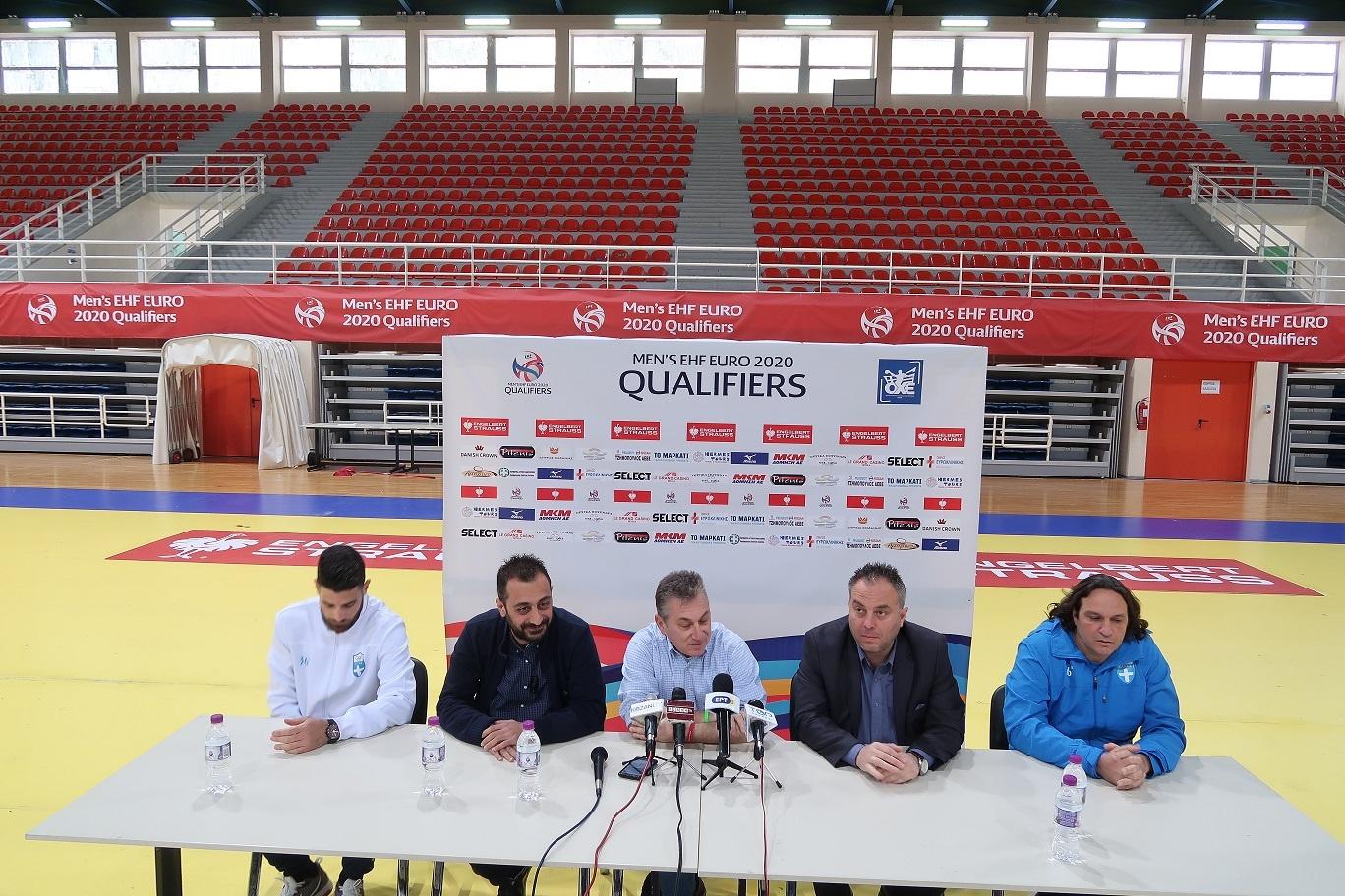 Κώστας Σταματιάδης (Γενικός Γραμματέας ΟΧΕ): «Καλώς σας βρήκαμε σε μία πόλη φιλόξενη και πολύ αγαπημένη για το χάντμπολ. Σήμερα σας καλέσαμε για τη συνέντευξη τύπου στο… πεδίο της μάχης, στον αγωνιστικό χώρο όπου θα παιχτεί ο σπουδαίος αγώνας με την Τουρκία για τον προκριματικό όμιλο του EURO 2020. Θέλω να ευχαριστήσω όλους όσους μας βοηθούν σε αυτή την προσπάθεια. Την Περιφέρεια Δυτικής Μακεδονίας και τον Δήμο Κοζάνης που είναι πάντα κοντά μας. Η δική τους συμβολή κάνει πετυχημένες όλες τις διοργανώσεις μας. Ευχαριστούμε πολύ τους χορηγούς μας, εγκαινιάζουμε μία συνεργασία με τη Danish Crown, που πιστεύουμε ότι θα συνεχιστεί. Μας ρωτούν για ποιο λόγο επιλέγουμε την Κοζάνη για τις διοργανώσεις μας. Πίσω μας υπάρχουν δεκαπέντε άνθρωποι, που ακόμη και τώρα συμβάλλουν στη διαμόρφωση του γηπέδου. Γι' αυτούς ερχόμαστε, για τους εθελοντές από το Δήμο και τα Σωματεία της πόλης, που όλες αυτές τις μέρες αφήνουν τις δουλειές τους και είναι επί 24ώρου βάσεως στη διάθεσή μας. Οφείλουμε να τους ευχαριστήσουμε από καρδιάς».