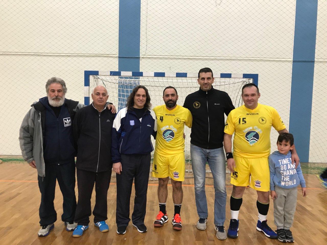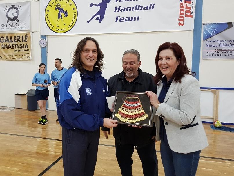 Δήμαρχος Σαλαμίνα Ισιδώρα Νάννου- Παπαθανασίου και ο Πρόεδρος του Αθλητικού Οργανισμού Γεράσιμος Δραγουμάνοβιτς, οι οποίοι τίμησαν τον προπονητή της Εθνικής Γιάννη Αρβανίτη.