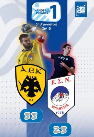 Την 5η νίκη της σε ισάριθμα παιχνίδια στη Handball Premier πανηγύρισε η ΑΕΚ που επιβλήθηκε άνετα με 33-23 των Βριλησσίων στο ΟΑΚΑ. Η Ένωση που είχε πρώτο σκόρερ τον Ηλιόπουλο (8 γκολ)δεν απειλήθηκε από τη νεοφώτιστη ομάδα, η οποία παρουσιάστηκε μάλιστα και με αρκετές ελλείψεις (Βαμβακας, Τσικογιαννόπουλος, Πέρρος, Χάλαρης)