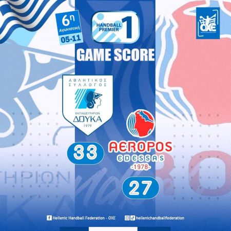 Με πρωταγωνιστή τον τερματοφύλακα Παναγιώτη Κολλύρη ο ΑΣΕ Δούκα πανηγύρισε την πρώτη του νίκη στο φετινό πρωτάθλημα της Handball Premier επικρατώντας του Αερωπού Έδεσσας με 33-27.