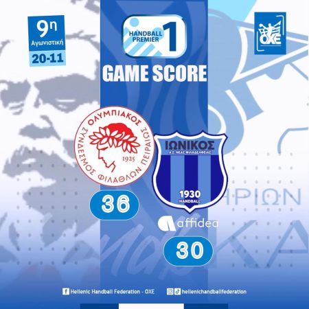 Στη 2η θέση της Handball Premier επέστρεψε ο Ολυμπιακός ΣΦΠ/Όμιλος Ξυνή που νίκησε 36-30 τον Ιωνικό Affidea στο κλειστό της Ηλιούπολης στο φινάλε της 9ης αγωνιστικής του πρωταθλήματος.