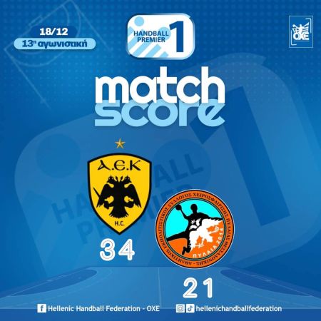 Επιστροφή στις νίκες για την ΑΕΚ που επιβλήθηκε άνετα του ΑΕΣΧ Πυλαίας 34-21 στην αυλαία της 13ης αγωνιστικής της Handball Premier και έφτασε τους 23 πόντους στη 2η θέση της βαθμολογίας.