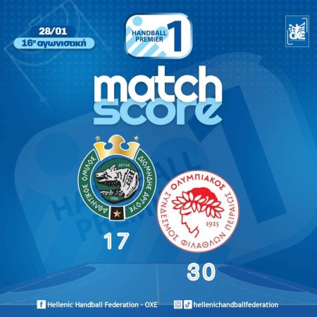 O Ολυμπιακός πέρασε εύκολα από το Άργος, επικρατώντας του Διομήδη με 17-30, στο πλαίσιο της 16ης αγωνιστικής της Handball Premier και πανηγύρισε τη 15η συνεχόμενη νίκη του στο πρωτάθλημα.