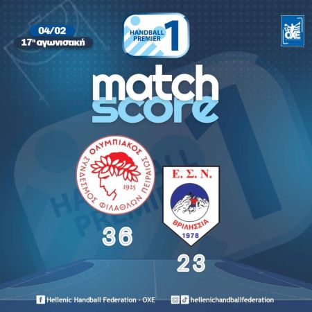 Τη 16η συνεχόμενη νίκη του στη Handball Premier πήρε ο Ολυμπιακός, που επικράτησε στην Ηλιούπολη των Βριλησσίων με 36-23.