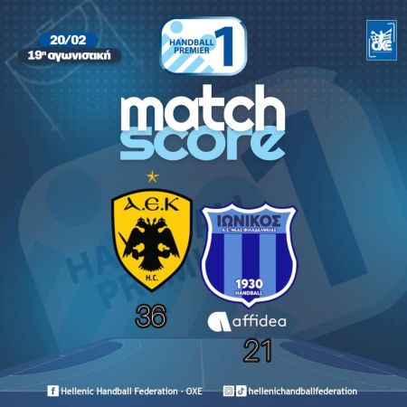 Στην κορυφή της Handball Premier με 35 βαθμούς επέστρεψε η ΑΕΚ μετά τη νίκη της με 36-21 επί του Ιωνικού Affidea στο φινάλε της 19ης αγωνιστικής του πρωταθλήματος.