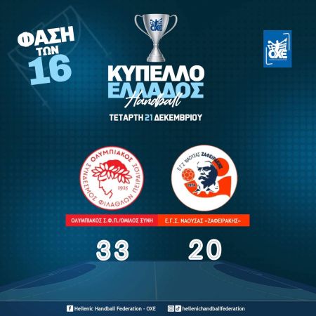 Εύκολη πρόκριση στα προημιτελικά του Κυπέλλου Ανδρών πήρε ο Ολυμπιακός ΣΦΠ/Όμιλος Ξυνή επικρατώντας 33-20 του Ζαφειράκη Νάουσας στο κλειστό της Ηλιούπολης.