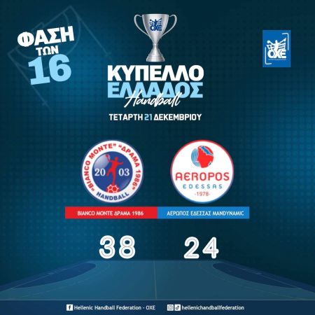 Με χαρακτηριστική άνση η Δράμα '86 επικράτησε του Αερωπού με 38-24 και προκρίθηκε στην προημιτελική φάση του Κυπέλλου Ελλάδος ανδρών.