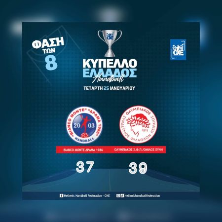Ο Ολυμπιακός προκρίθηκε για τρίτη φορά στην ιστορία του σε φάιναλ φορ του Κυπέλλου Ελλάδος, καθώς νίκησε εκτός έδρας τη Δράμα ’86 με 39-37 σε έναν αγώνα που κρίθηκε στα πέναλτι (κανονική διάρκεια 30-30 , παράταση 35-35). Στον ημιτελικό του φάιναλ φορ, οι ερυθρόλευκοι θα αντιμετωπίσουν την ΑΕΚ, που με τη σειρά της απέκλεισε την Πυλαία.