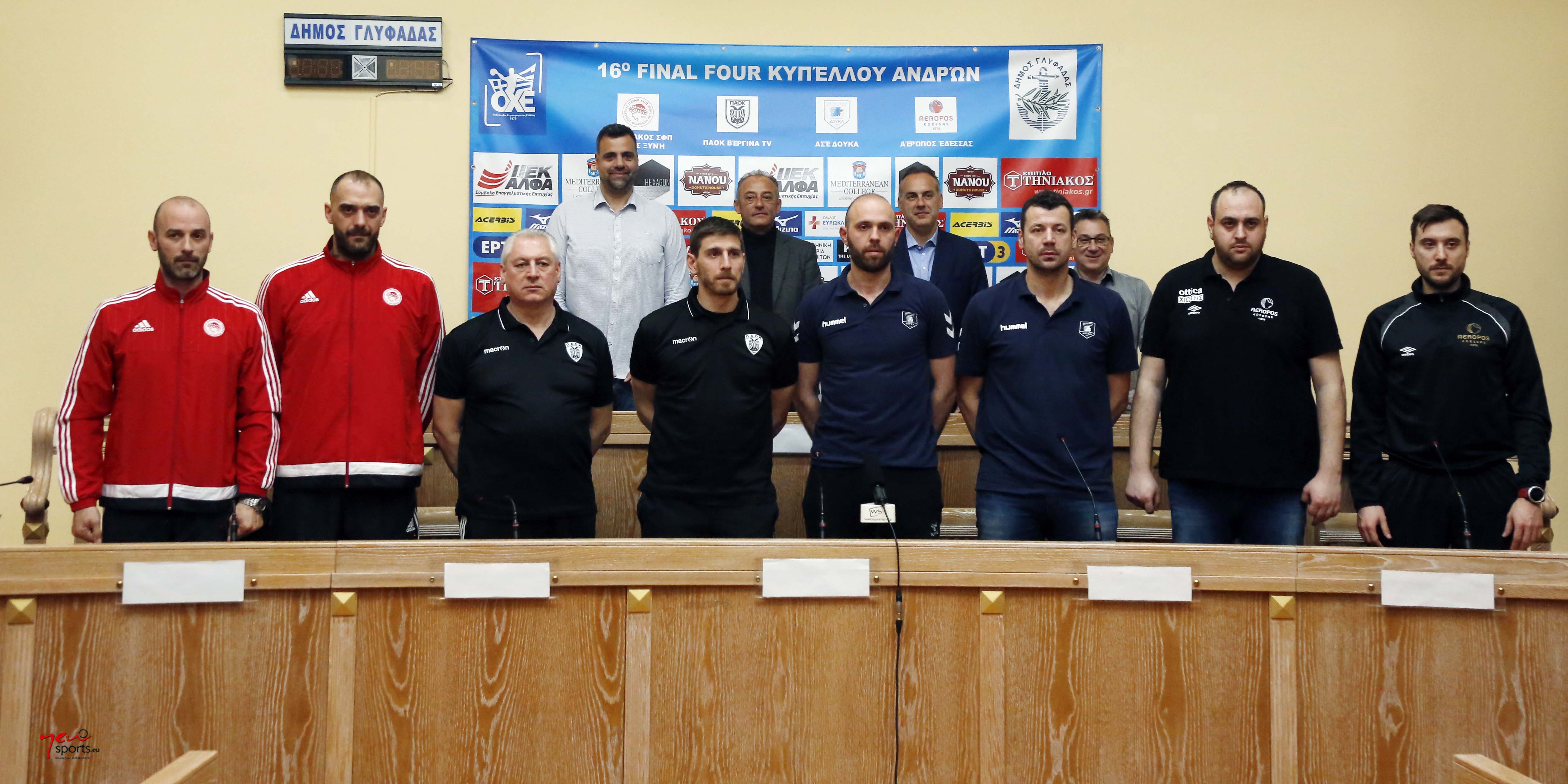 Πραγματοποιήθηκε στο Δημαρχείο Γλυφάδας η επίσημη συνέντευξη Τύπου του 16oυ Final Four του Κυπέλλου Ελλάδος Ανδρών που θα διεξαχθεί στο ΔΑΚ «Μάκης Λιούγκας» το Σαββατοκύριακο 10-11 Μαρτίου, με την συμμετοχή των σωματείων Ολυμπιακός ΣΦΠ/Όμιλος Ξυνή, ΠΑΟΚ ΒΕΡΓΙΝΑ TV, ΑΣΕ Δούκα και Αερωπός Έδεσσας.