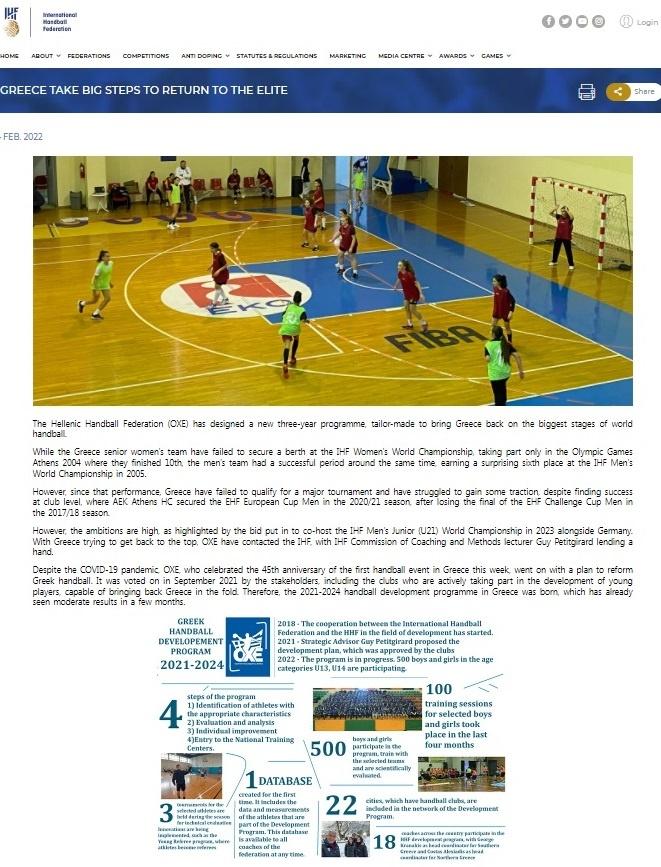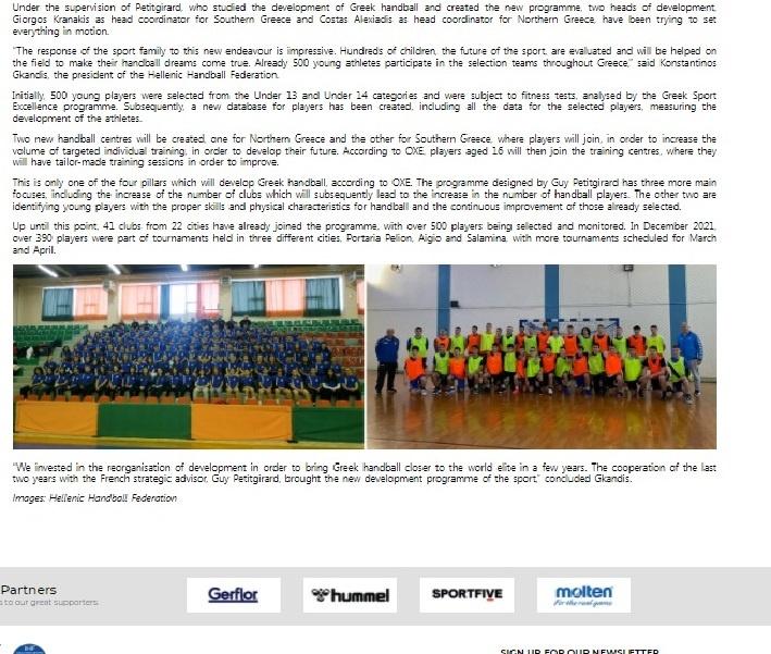 Συγκεκριμένα γίνεται αναφορά στο νέο πρόγραμμα ανάπτυξης για να επανέλθει η Ελλάδα στην ελίτ του παγκόσμιου χάντμπολ.