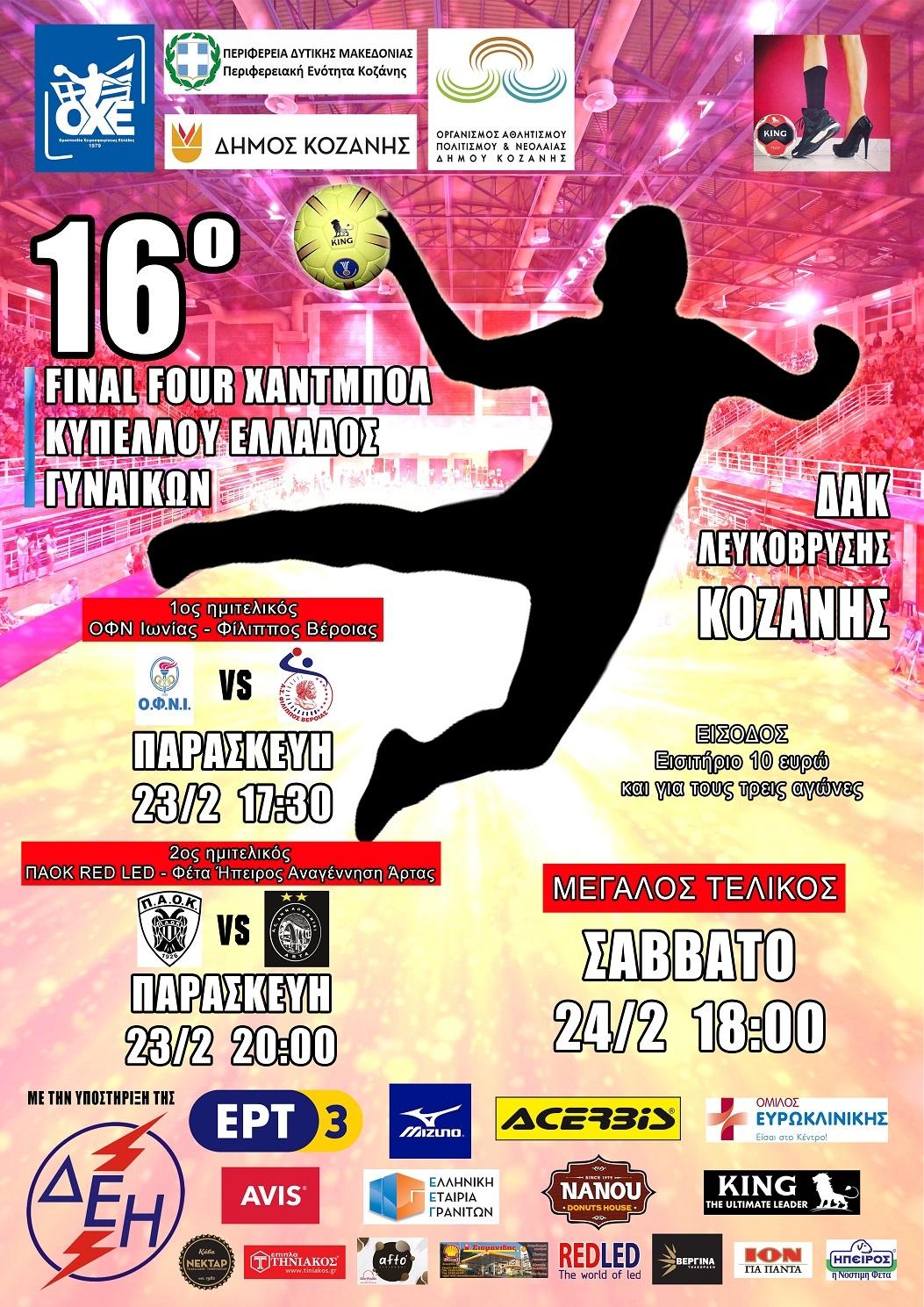 Αύριο Πέμπτη 22 Φεβρουαρίου 2018 και ώρα 15:30 στη Κοβεντάρειο αίθουσα του Δήμου Κοζάνης (οδός Χαρισίου Μούκα 7) θα πραγματοποιηθεί η επίσημη συνέντευξη Τύπου του 16oυ Final Four του Κυπέλλου Ελλάδος Γυναικών, παρουσία του Γενικού Γραμματέα της Ομοσπονδίας Χειροσφαιρίσεως Ελλάδος Κώστα Σταματιάδη, του Αντιπεριφερειάρχη Οικονομικών Δυτικής Μακεδονίας Ηλία Κάτανα, του Προέδρου του ΟΑΠΝ Δήμου Κοζάνης Γιάννη Ιωαννίδη, του Τομεάρχη Επικοινωνίας Ενεργειακού Κέντρου Δυτικής Μακεδονίας της ΔΕΗ Χρήστου Παπαδόπουλου, καθώς και εκπροσώπων των τεσσάρων φιναλίστ, ΟΦΝ Ιωνίας, Φιλίππου Βέροιας, ΠΑΟΚ RED-LED και Φέτα Ήπειρος Αναγέννησης Άρτας.
